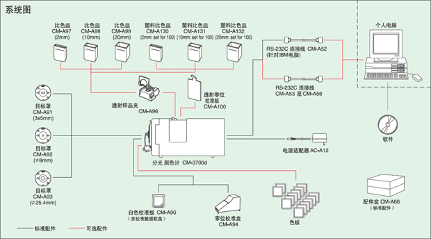 | 可選配件 | 透射樣品夾CM-A96,透射零位校正板CM-A100,比色皿CM-A97、98、99,塑料比色皿CM-A130、131、132 色彩管理軟件CM-S100w | |||||||||||