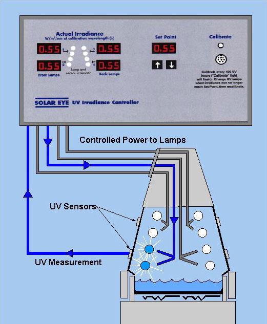 由上圖可知,QUV通過主板控制紫外燈燈管的光照強度,燈管發光后,由機器內部的光照強度傳感器探頭感應到光強,再反饋回主板進行分析比較,然后再進行調節,直到實際的照度值與設定值一致。當照度設定好后,整個調節過程由機器自動進行。