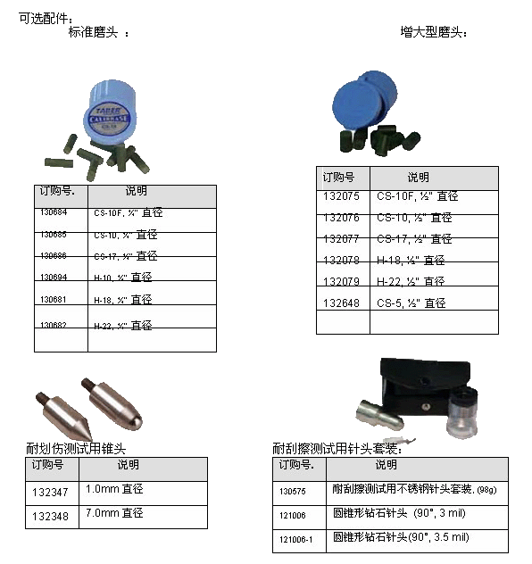 包括5750主機,3個250g圓盤形砝碼,10個CS-10和5個H-18磨頭橡皮,50張S-14砂紙和磨耗深度度量器等。