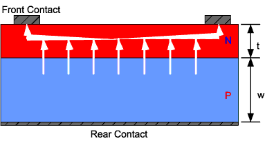 典型的晶體電池片尺寸,厚度小于200微米,邊長156毫米。 太陽光照射在紅色的區域上引起電子的定向移動,能量通過上下電極傳導出來 數片晶體電池片連接到一起組成一個組件,數塊組件連接在一起達到可用的電壓,將電能輸送出來。